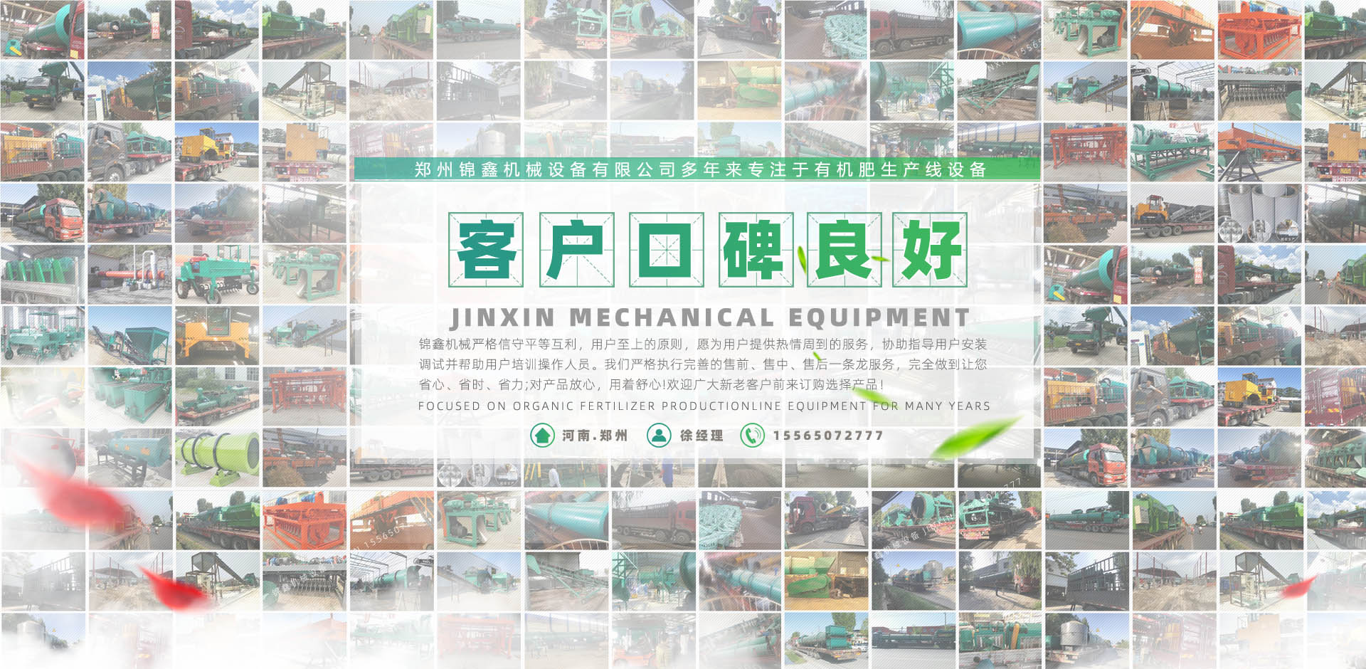 鄭州錦鑫機械設備有限公司,位于機械之鄉的河南省滎陽市,它交通便利,連霍高速公路、鄭州西南繞城高速、隴海鐵路、鄭西客運專線貫穿全境,南水北調、西氣東輸在這里交匯。   公司有技術團隊為企業生產肥料加工設備,有的合作伙伴,科學、規范的客戶培訓體系;還有積極健康的企業文化,不斷創新的管理體制和經營模式和日益完備的經銷網絡。它交通便利,310國道、連霍高速公路、鄭州西南繞城高速、隴海鐵路、鄭西客運專線貫穿全境,南水北調、西氣東輸在這里交匯。   鄭州錦鑫機械設備有限公司是生產有機肥設備機械的企業,產品:有機肥設備,有機肥造粒機,復合肥設備,復合肥造粒機,新型有機肥攪齒造粒機,對輥擠壓造粒機,有機肥生產線,有機肥加工設備,復合肥生產設備,有機肥造粒設備,雞糞烘干機,轉鼓造粒機,bb肥設備等遠銷各地,品質深受肯定! ...